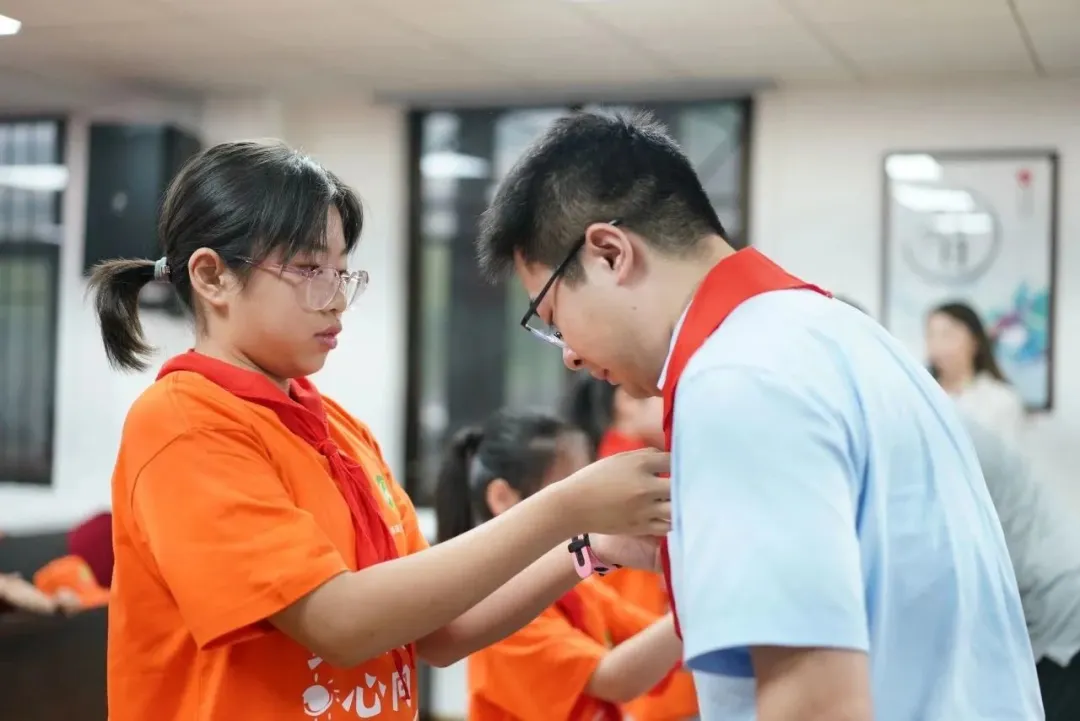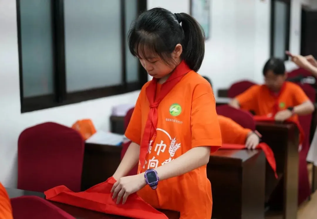 此外,还有三位孩子作为代表营员在为一会儿给嘉宾佩戴红领巾环节做准备,整理、互相试戴、走位,不落下一丝一毫的细节。