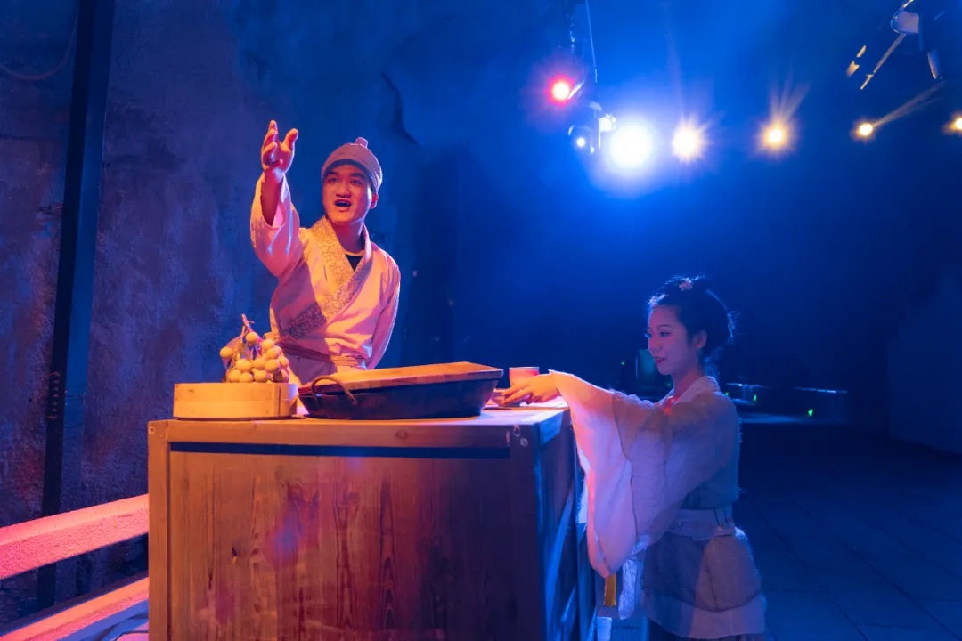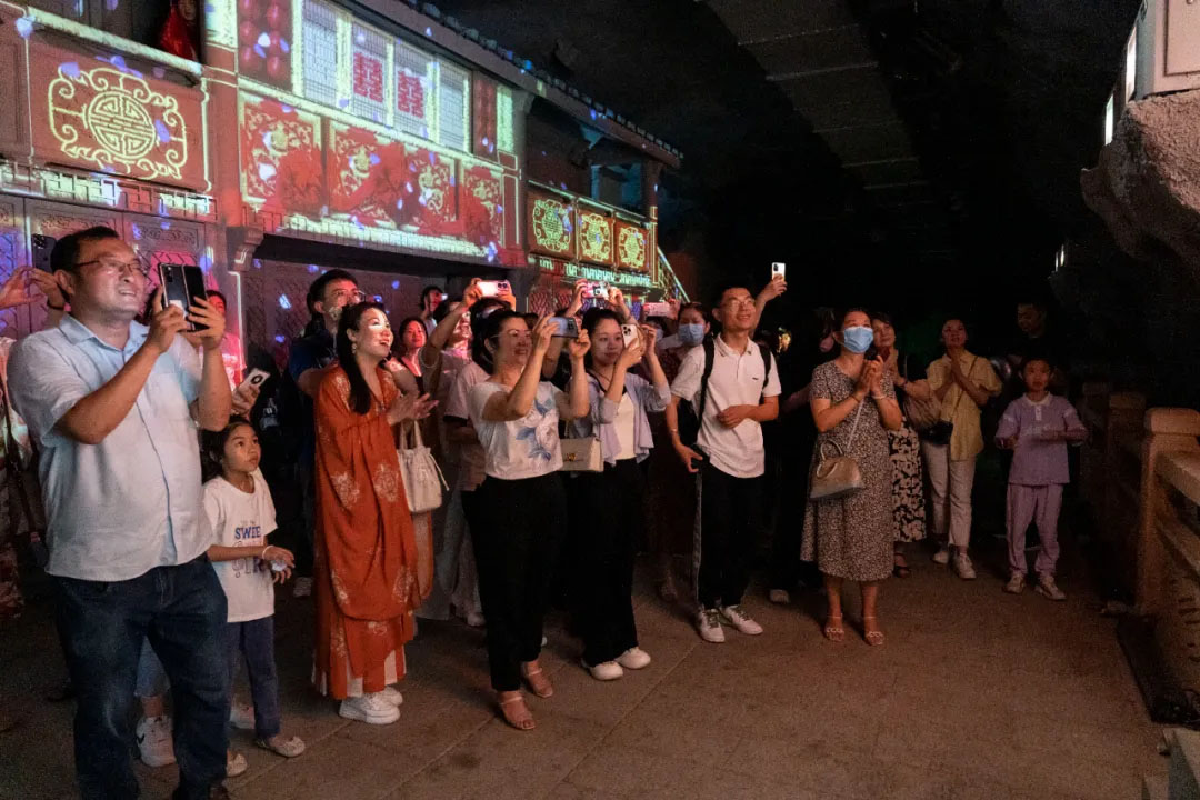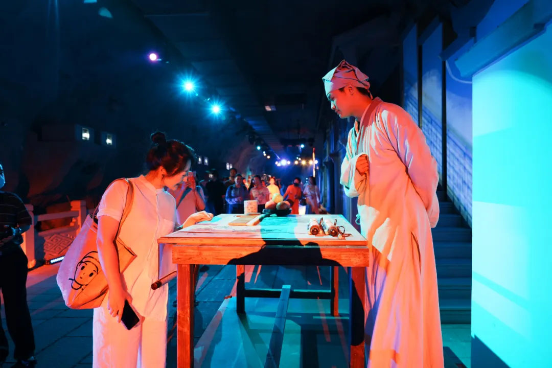 循着叫卖鱼丸、肉燕等福州小吃的声音,文化讲解志愿者在现场也成为寻梦闽都故事的参与者,大家与演员近距离互动,在现代光影科技中一同走进闽都千年历史。