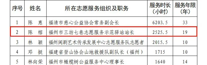 陈榕投身志愿服务19年,在担任三坊七巷志愿服务驿站站长期间,她积极协助站内完成《三坊七巷志愿服务示范驿站章程》《工作手册》《三坊七巷文化志愿服务队档案》等材料修订编撰;并参与日常管理,做好三坊七巷街区文明窗口建设工作,搭建良好的服务平台。