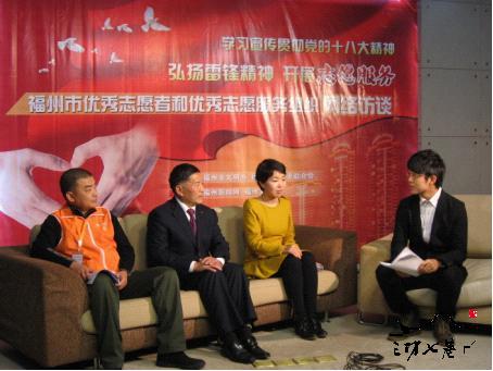 2012年12月12日下午,2011—2012年度福州市优秀志愿者三坊七巷志愿讲解员曾世康、2011年全国优秀志愿者后县社区主任章欢芳、2011—2012年度福州市优秀志愿服务组织代表黄昊卿等,在福州日报社9楼参加了由福州市文明办、福州市志愿者联合会主办,福州新闻网、福州文明网承办的福州市优秀志愿者和优秀志愿服务组织网络访谈。在访谈中,主持人和曾老师等嘉宾畅谈了志愿服务方面的话题。曾老师也总结了他在三坊七巷景区担任志愿者讲解员两年多来的心得和感悟。这几年来他风雨无阻的坚持,不仅为来自五湖四海的游客带去了三坊七巷的历史文化,更让他们领悟到了福州志愿者的形象和精神。(文/林秉元 图/曾世康)
