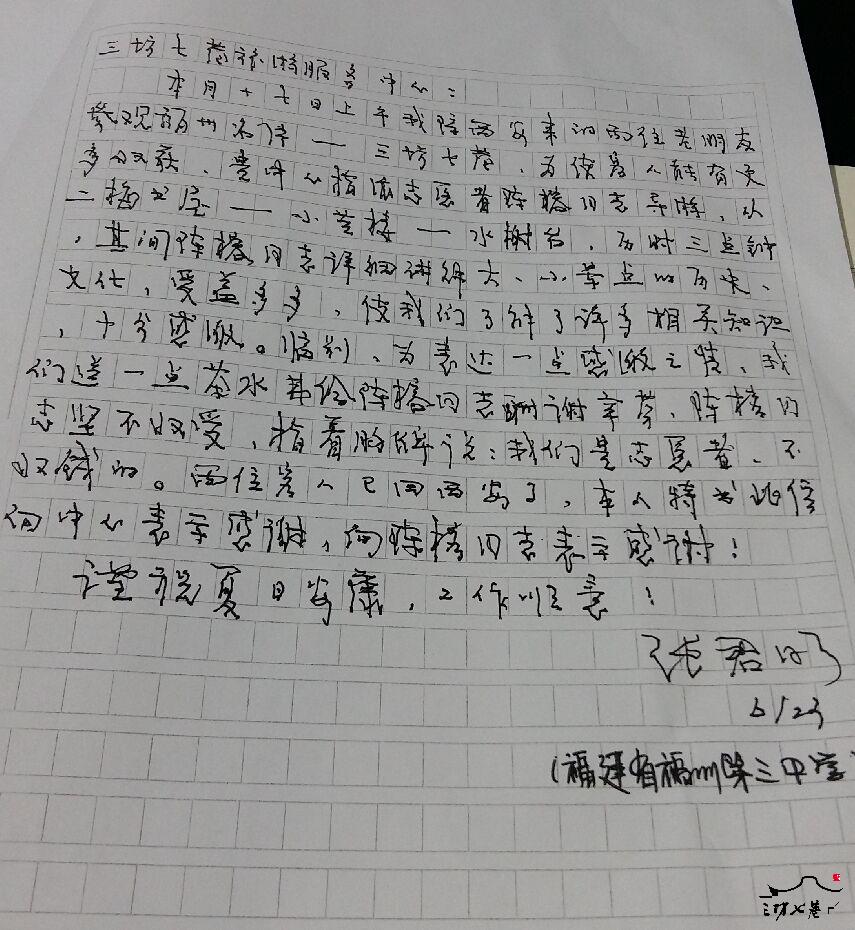 2015年6月23日,三坊七巷游客服务中心收到了来自福州市第三中学张老师寄来的一封感谢信。他在信中说到:6月17日上午他与两位西安的朋友一起到三坊七巷参观游览,游客服务中心安排志愿者陈榕为其讲解,全程3个多小时,陈榕同志细致周到的讲解使其本人与朋友均受益良多,讲解结束时他本想以茶水费作为酬谢,却被陈榕同志婉拒,她说她是景区的一名志愿者,讲解服务是完全义务的,这让张老师及其朋友深受感动。