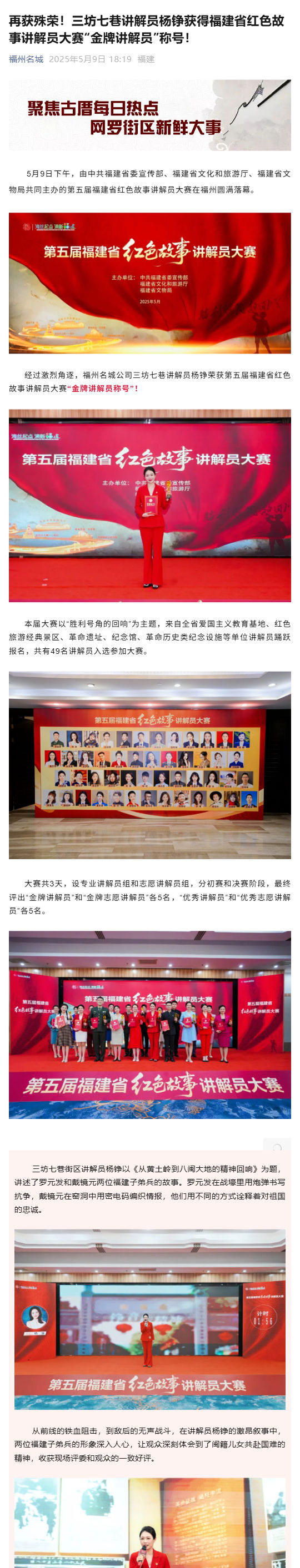 再获殊荣!三坊七巷讲解员杨铮获得福建省红色故事讲解员大赛“金牌讲解员”称号!