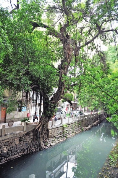 “原来都是小叶子,突然发现,一棵榕树上居然还出现了宽叶。”70多岁的方大爷祖祖辈辈一直生活在朱紫坊安泰河边,朱紫坊31号老宅门口的榕树并不起眼,没有龙墙榕的千年历史,但是榕树与笔管榕合生的它,百变的造型让附近的居民印象深刻。