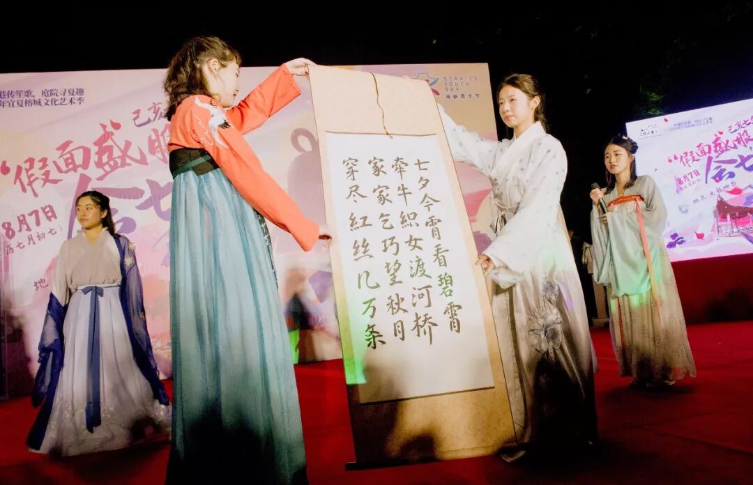 在南后街上,前来福州参加第七届海峡青年节的青年朋友们,用一场诗书画快闪,带我们感受了闽台七夕同根同源的文化风采。