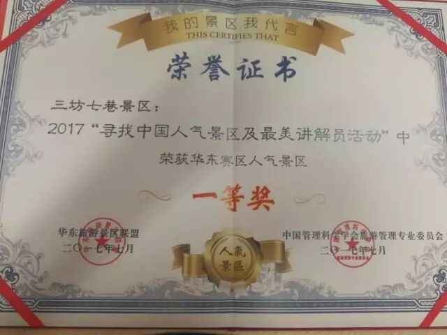 7月23日,2017"寻找中国人气景区及最美讲解员活动"在浙江嘉善县云澜湾小镇举行。经过了网友投票、专家评选等环节,三坊七巷景区在百余家5A及4A级景区参与的这场大赛中,凭借超高人气喜获人气景区一等奖;人气推荐景区;景区讲解员林杭镔参加“寻找最美讲解员”评选活动,在50多名参赛选手中脱颖而出获二等奖!