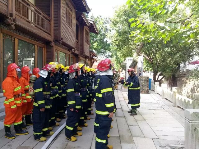 今天参加联合演练的单位有:三坊七巷保护开发有限公司,鼓楼消防大队,三坊七巷消防中队,水部消防中队,鼓东消防中队,朱紫坊安保队。