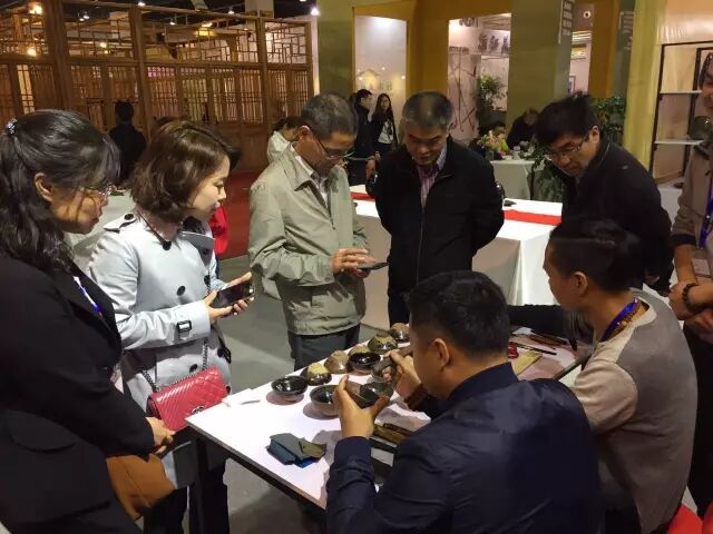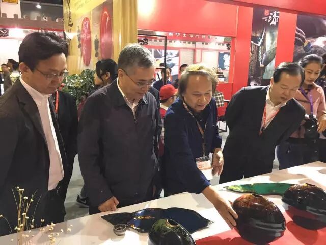 展览现场,文化部项兆伦副部长(左二)与福州市漆艺术研究院阮界望老师(左三)正在进行交流。