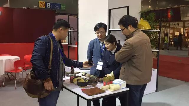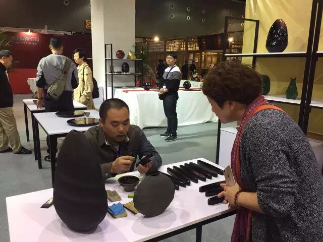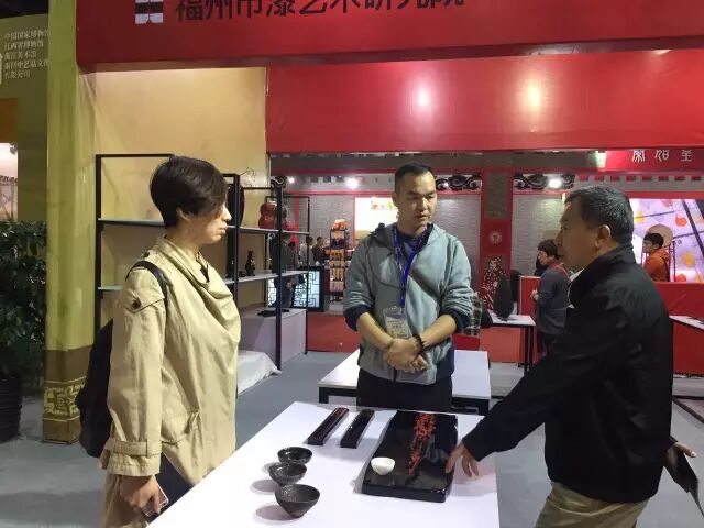 福州市漆艺术研究院展区的参展人员在向市民介绍漆艺产品。