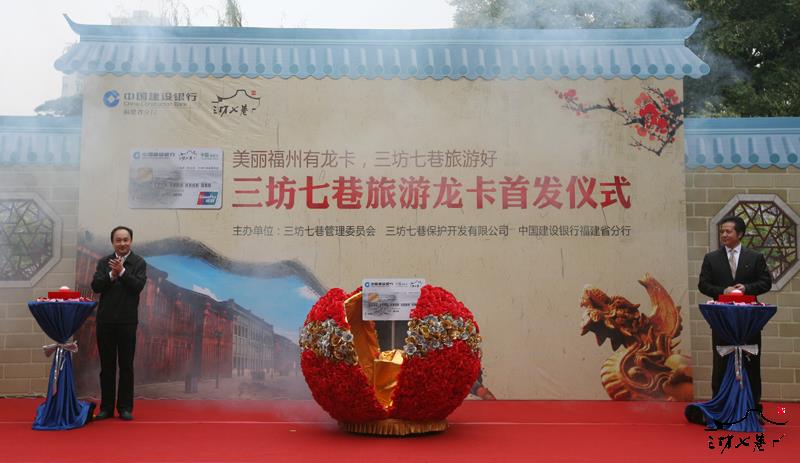 12月8日,三坊七巷管理委员会与中国建设银行福建省分行共同发行三坊七巷旅游龙卡。这是福州市首张以旅游文化景区命名的银行卡。三坊七巷是福州市著名旅游文化景区,荣获“中国十大历史文化名街”、“国家4A级旅游景区”、和“中国首座生态(社区)博物馆”等多项荣誉称号,是中国都市仅存的一块“里坊制度活化石”。此次中国建设银行福建省分行与三坊七巷管委会共同推广发行“三坊七巷旅游龙卡”,将福州传统旅游文化与建行金融服务文化相融合,开创了旅游文化与金融产品相结合的首例。三坊七巷旅游龙卡卡面精美,体现了三坊七巷古老文化名居,艺术构图极具收藏意义。该卡为银联龙卡通IC卡,具有现金存取、支付结算、购物消费、证券交易、外汇买卖、账户管理、理财签约服务、电子现金快速支付等龙卡借记卡所有的金融功能。同时,三坊七巷龙卡还加入了中国旅游卡的各项功能,为持卡人提供景区、酒店、保险、购物等旅游相关的全方位特惠服务,享有全国百家景点门票刷卡购票5-8折优惠折扣;同时还精选特惠酒店,买两晚,一晚免费,送完为止。全国千家特惠商户,吃喝玩乐享各类折扣。2014年3月底前,在福州各建行网点申办三坊七巷旅游龙卡即可赠送三坊七巷精美卡套,先到先得。