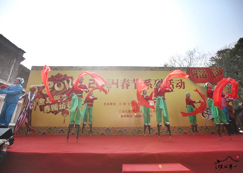 正月初一,在南后街街面上,闻名全国、屡获大奖的高湖舞龙、浦下舞狮队、沙县肩膀戏、福州独具特色的洪塘踩高跷等,揭开三坊七巷甲午年新春的序幕。异彩纷呈的传统民俗文化表演融合了杂技、戏曲等民俗表演形式,趣味观赏性强。以光禄吟台为主舞台,然后踩街至三坊七巷中心旗杆、南后街石牌坊等地点进行表演,飞旋的金龙及欢腾热闹的群狮将与广大市民游客朋友一同欢度新春。