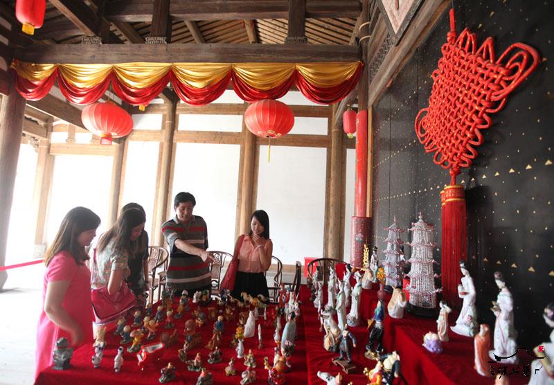 游客在三坊七巷天后宫内体验传统中秋节民俗文化活动“摆塔”