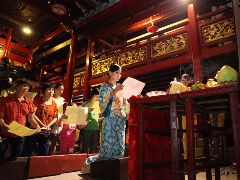 9月19日,三坊七巷郎官巷天后宫举行拜月仪式。当晚天后宫设香案,为前来拜月祈福的市民免费提供场地,现场还有专人担任赞礼、执事等,指导市民拜月的礼节。