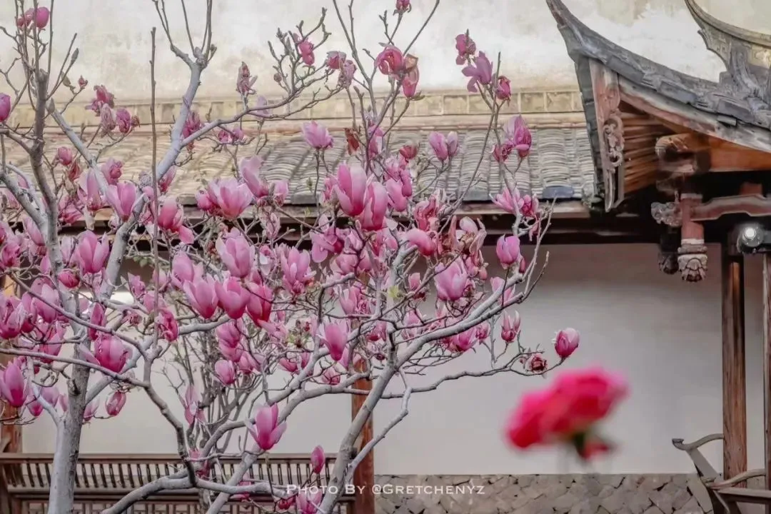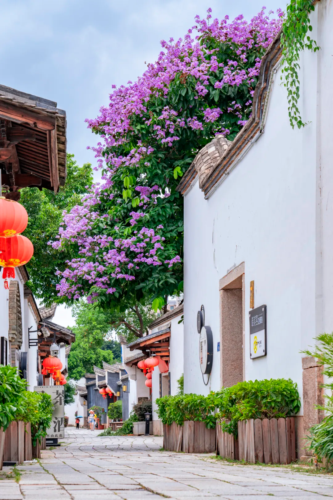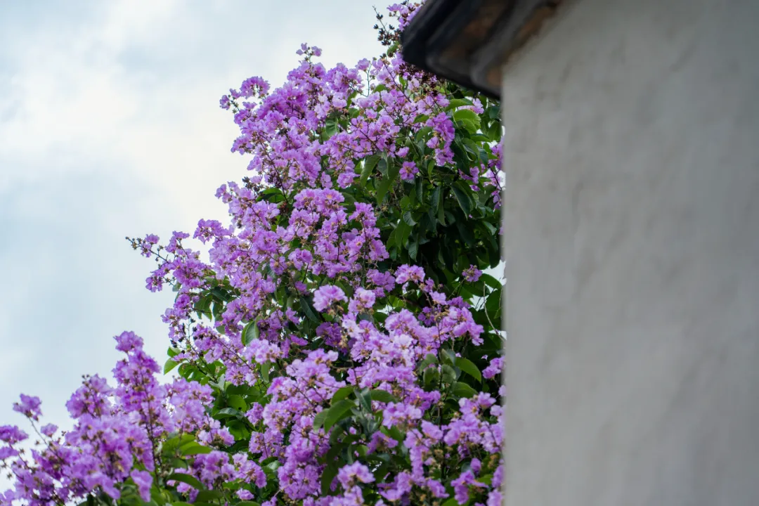 紫薇花映衬着古厝风景构成一幅层次丰富