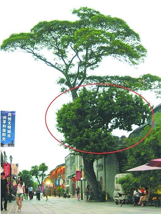 我在南后街附近看到,一棵大叶榕(加圈处)的“胡须”将直径三四十厘米的凤凰树包裹得严严实实,造就了一体树身伸展两种枝叶的情形。“三坊七巷每天游人如云,对于这样有趣的自然景观,如果配上牌子说明,说不定还可以成为游客新的观赏点呢!”附近居民陈先生建言。