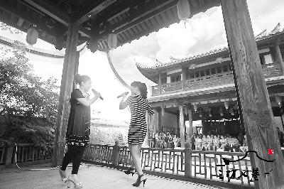 2日,福州三坊七巷水榭戏台古曲声声,越剧省级“非遗”传承人、尹派第六代传人王一敏与越剧戏迷相聚一堂,共同领略传统艺术的风采。图为王一敏(左一)与搭档陈翠红演绎新排剧目《马前泼水》。