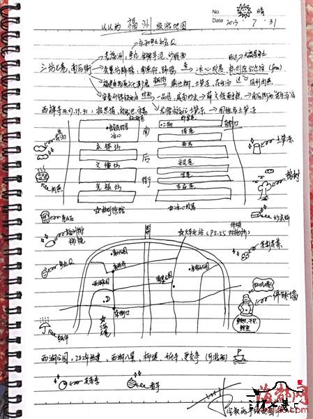 这张手绘地图是画在笔记本上的,题目叫“uu的福州旅游地图”。“@时光与你不期而遇”先用文字简单记录了三坊七巷的美食、景点,比如“老福洲”的鱼丸、金牌芋泥、炒线面,朱紫坊的蹄膀、南煎肝等。