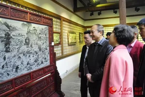 福建省文化厅副厅长 陈吉(左二)参观惠安女影雕作品展。