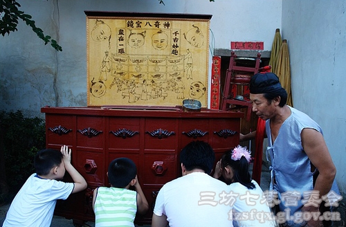 走在福州的南后街上,忽然听到一阵阵鼓罗的敲击声,看到前面围着很多人,挤进去一看,只见四五个人坐在长条凳上、弯腰通过小窗孔往木箱子里看,箱子上方写着五个大字:“神奇八宝镜”,这不就是所谓的西洋镜吗。前些时在杭州古街河坊街曾见过一次,装束基本一样,只是表演内容有所不同。表演者不停地拉着一边的换景绳,变换着箱子顶部的挡板改变光线,嘴里还用口技发出鸭子、鸟的叫声,并提示观看者看到了什么。几分钟的表演,观者个个称奇。