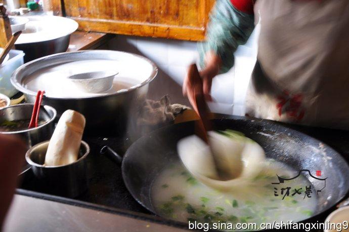 鼎边糊是用大米加清水磨成浓浆,摊在锅边,半熟后铲入正在熬煎的虾汤中,煮制而成。这是现场版的制作。