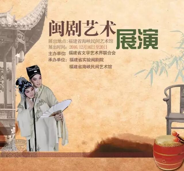 由福建省文学艺术界联合会主办,福建省实验闽剧院、福建省海峡民间艺术馆承办的“闽剧艺术展演”乃是福建省内首次初具规模、极具专业性的闽剧艺术展,共展出实物展品30件,并持续展至2016年12月20日。本次展览将福建人引以为傲的国家级非物质文化遗产——闽剧全方位地在三坊七巷福建省海峡民间艺术馆内展出,从闽剧的历史开始,带您走进闽剧奠基人曹学佺的一生、闽剧经典人物贻顺哥以及闽剧经典、精品和获奖剧目背后的故事。同时展出的还有郑奕奏、洪深、林务夏等著名闽剧表演艺术家曾使用的舞台道具、服饰等珍贵展品,为本次展览添上了生动的一笔。