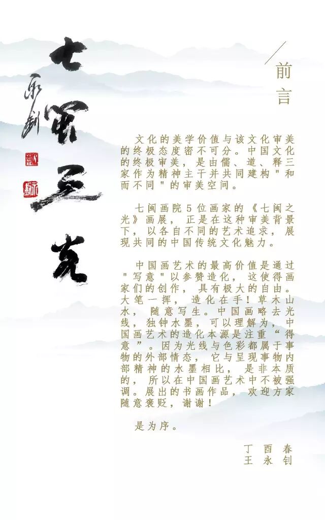 “七闽”起初是专指周朝时散居在今福建和浙江南部的七支以蛇为图腾的闽族后裔部落,后来演变成泛指福建。“七闽之光”画展主要宣扬福建传统文化。