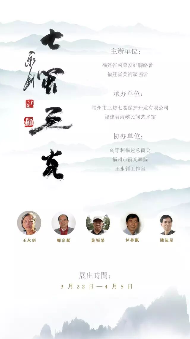 “七闽之光”画展将于3月22日在福州三坊七巷福建省海峡民间艺术馆举办。展览由福建省国际友好联络会、福建省美术家协会主办,福州市三坊七巷保护开发有限公司、福建省海峡民间艺术馆承办,匈牙利福建总商会、福州市霞光画院、王永钊工作室协办。