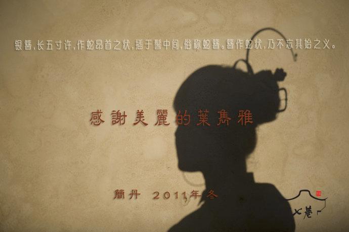 小雅把拢紧了的发束盘缠成发髻,对着妆镜,再将蛇形簪插入髻中间,簪子须得是中正昂然的,有如神器。其它金钗玉瓣则斜斜地插入发中,颤巍巍地摇摆出怜人之态。她妆罢起身,穿上百纳千层的布底绣花鞋,轻轻拍打棉布襟衫上微皱了的褶子,清丽秀美地走进了三坊七巷。