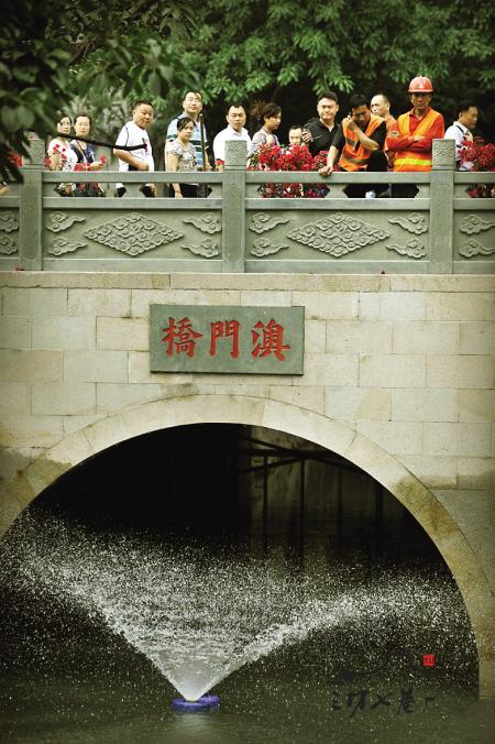 昨日,福州市澳门路,行人站在澳门桥上观看喷泉。近日,安泰河部分整治后的河段,已是水清鱼游,而澳门路至通湖段,7个蓝色的水泵在水面上喷泉,特别吸引路人眼球。据了解,这种水泵还有活水制氧功能。