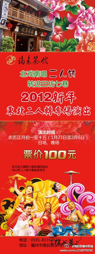 2012新年东北二人转专场演出,北戏南唱二人转转进三坊七巷。演出时间: 农历正月初一至十五(1月23日至2月6日)