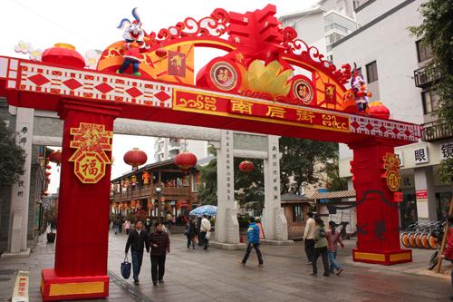 南后街南、北口将分别设门罩,以兔子为主题,市民游客只要一到这两大门口,一抬头就能见到欢笑的“兔子”——表情俏皮可爱。昨日,这两门罩高高立起,已提早亮相,走进北大门,风雨廊上也已悬挂各色传统花灯,供游客争睹。
