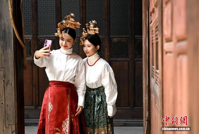 6月23日,游客郑榕晴(左)、顾语轩戴软木画头饰在福州上下杭历史文化街区旅拍。中新社记者 吕明 摄