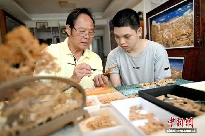 6月21日,陈国弦在位于福建福州的工作室里,为18岁的徒弟蒋涵威传授软木画相关知识。中新社记者 吕明 摄