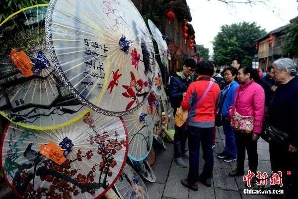 中国农历春节期间,游客在福州三坊七巷被花样繁多的油伞吸引。福州纸伞是历史悠久的汉族传统手工艺品,属于福州三宝之一。做工精细, 采用油画、彩画喷花和绢印等方法,在纸伞上绘制了花鸟、山水、人物等图案,十分雅致美观。