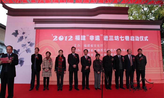 1月9日上午,“2012年福建非遗进三坊七巷活动”的启动仪式在光禄吟台隆重举行。文化部副部长王文章,省委常委、副省长陈桦,文化部非遗司司长马文辉,省政府副秘书长李强,福建省文化厅厅长陈秋平,福州市委常委、宣传部长朱华,福州市副市长黄忠勇等领导同志出席了启动仪式。启动仪式后,霍童线狮、建瓯挑幡等民俗表演在南后街轮番上演,闽剧、越剧、京剧、南音、提线木偶等在水榭戏台纷纷登场。