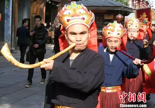在福州三坊七巷吹奏“龙角声声”。