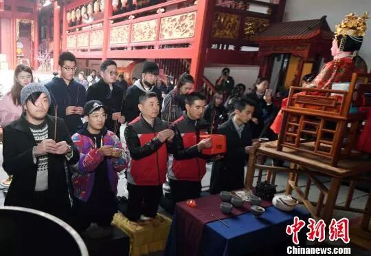 参加体验营活动的两岸青年共同参加了三坊七巷天后宫举行的“茶帮拜妈祖”祭祀典礼。妈祖神像前,由主祭带领下,沸水扬汤,浣洗仙茶。“一滴撒天天清,一滴撒地地宁,三滴撒水海晏河清,护我茶路永得太平”,富有水上茶路和茶帮特色的祭祀用语,为参与祭祀典礼的年轻人铿锵吟诵。