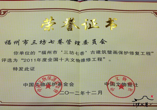 党的十八大为我国文物事业发展指明了方向,“以科学发展观为指导,全面推进文物保护利用和传承发展”。为此,由中国文物保护基金会主办的“2012第二届中国文物保护年会暨2011年度十大文物维修工程表彰活动”于12月22-23日,在京隆重召开。“福州市三坊七巷古建筑壁画保护修复工程”被评选为“2011年度全国十大文物维修工程”。