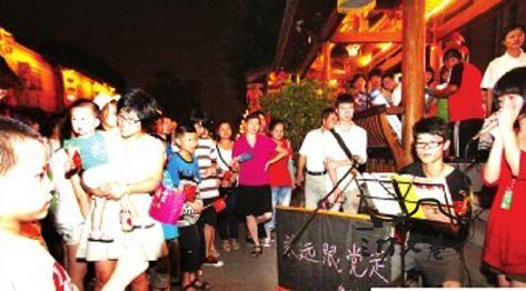 而在南后街北口的风雨廊内,两名年轻人在这里自弹自唱《永远跟党走》(如图)。