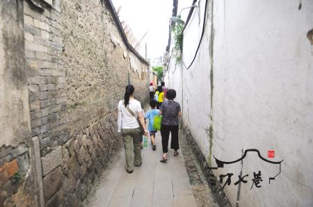 孩子们扯出尺子,量了一下巷子的宽度,除了拓宽了的雅道巷,其余的小巷宽均在一米七左右,不同的小巷相差不过10公分,旧时只容一个人背着挑担通过。而现在,三个7岁左右的小孩子,并排在小巷中,重新体验了这个窄窄的空间,他们踏着仿古的青石板,无比欢乐地笑着。在闽山巷里有郑孝胥故居的后门,一位叫陈易非的小朋友,一下子就说出了郑孝胥是清代的举人,政治家书法家等,家长们吃了一惊,纷纷询问他怎么知道这么多历史,小陈的好伙伴谢懿德告诉大家,小陈今年7岁,已经看完了整部《三国演义》,很喜欢学历史。