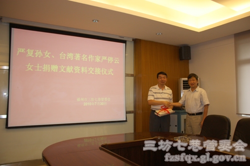同年7月30日下午,严停云女士委托省委党校科技•软科学教研部主任、省严复研究会副会长严以振教授向三坊七巷管委会捐赠了书籍资料、严复手稿及部分她创作的小说。