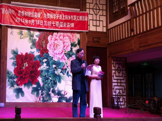 1月18日晚,由三坊七巷管委会、鼓楼区慈善总会、福州一中联合主办的“爱心同行—青春和谐送温暖”为贫困学子送上回乡车票义演活动在南后街福来茶馆举行。义演中,福州一中的同学表演了诗朗诵《春》、快板《情满人间》等精彩的节目,为经济困难学生筹集善款,助他们顺利返乡,让贫困大学生感受到社会各界的关怀和温暖。