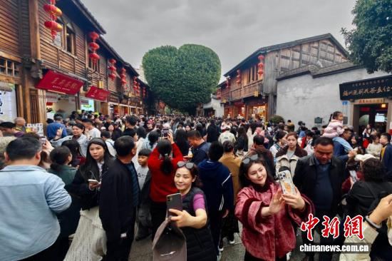 2月23日,春节假期最后一天,福建福州南后街爱心树吸引许多游客打卡。