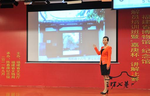 为纪念辛亥革命一百周年,福建省文化厅、福建省文物局主办,陈嘉庚纪念馆承办的福建省博物馆、纪念馆“嘉庚杯”讲解比赛,2011年9月27日至28日在陈嘉庚纪念馆举行,来自全省博物馆、纪念馆170名讲解员参加培训,全省66名讲解员参加比赛。讲解比赛经过一天半紧张、激烈的角逐落下帷幕,圆满完成所有赛程,我馆讲解员师翠翠在此次比赛中荣获三等奖。