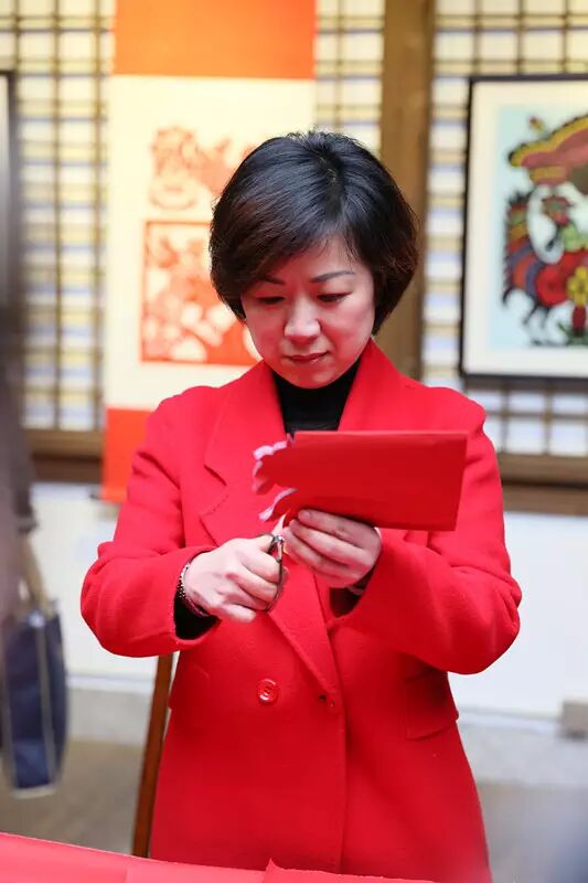福建拓荣剪纸协会秘书长金素清现场展示剪纸技艺