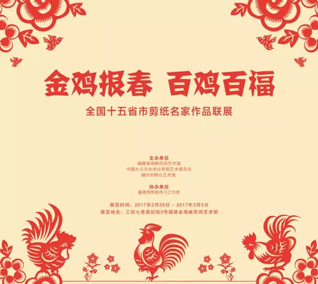 2017 年 2 月 28日—2017 年 3 月 5日,“金鸡报春 百鸡百福——全国15省市剪纸名家作品联展”在福州三坊七巷南后街3号福建省海峡民间艺术馆展出。本次展览由福建省海峡民间艺术馆、中国大众文化学会剪纸艺术委员会、福州市群众艺术馆联合主办,董雅萍剪纸传习工作室协办,展览共展出了来自全国各地15个省市80位艺术家的100余件(套)剪纸艺术作品,每幅作品都蕴含着创作者对于新年的憧憬和希望。