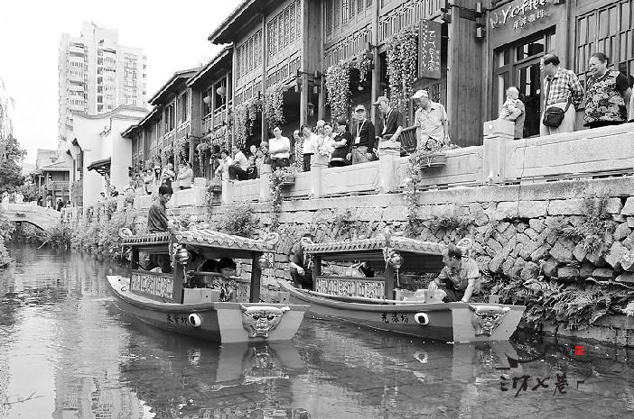 一切准备就绪,昨日10:20,游船从老佛殿桥码头出发,在通湖路桥与澳门路桥之间的河道来回试航。由于河道较窄,遇到船掉头,船工就把电瓶关掉,改用竹竿撑船。