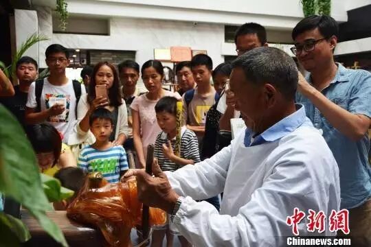 在麦芽糖制作现场,只见特制的糖钩上,非遗传承人双手各持一根细木棍,挑起搁置在糖钩上的麦芽糖的两端,用力朝外拉,然后将两条拉成绸缎般的糖丝互搓,拧成麻花状,再将糖丝倒扣回糖钩上,经过循环反复的拉搓,麦芽糖渐渐越拉越白。
