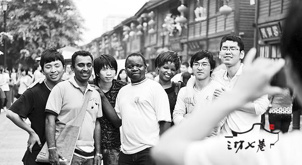 在南后街,记者遇到了十几名前来游玩的外国人,他们拿着相机到处拍摄。一些热情的福州市民主动上前与他们合影,老外们乐呵呵地来者不拒。