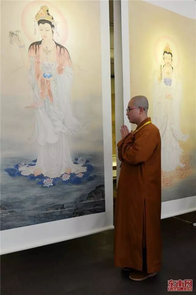 本次巡展共吸引了百余名禅文化爱好者。图为一位僧人在画像前。