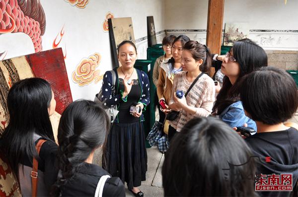 闽江学院美术学院漆艺老师在漆艺展现场讲解